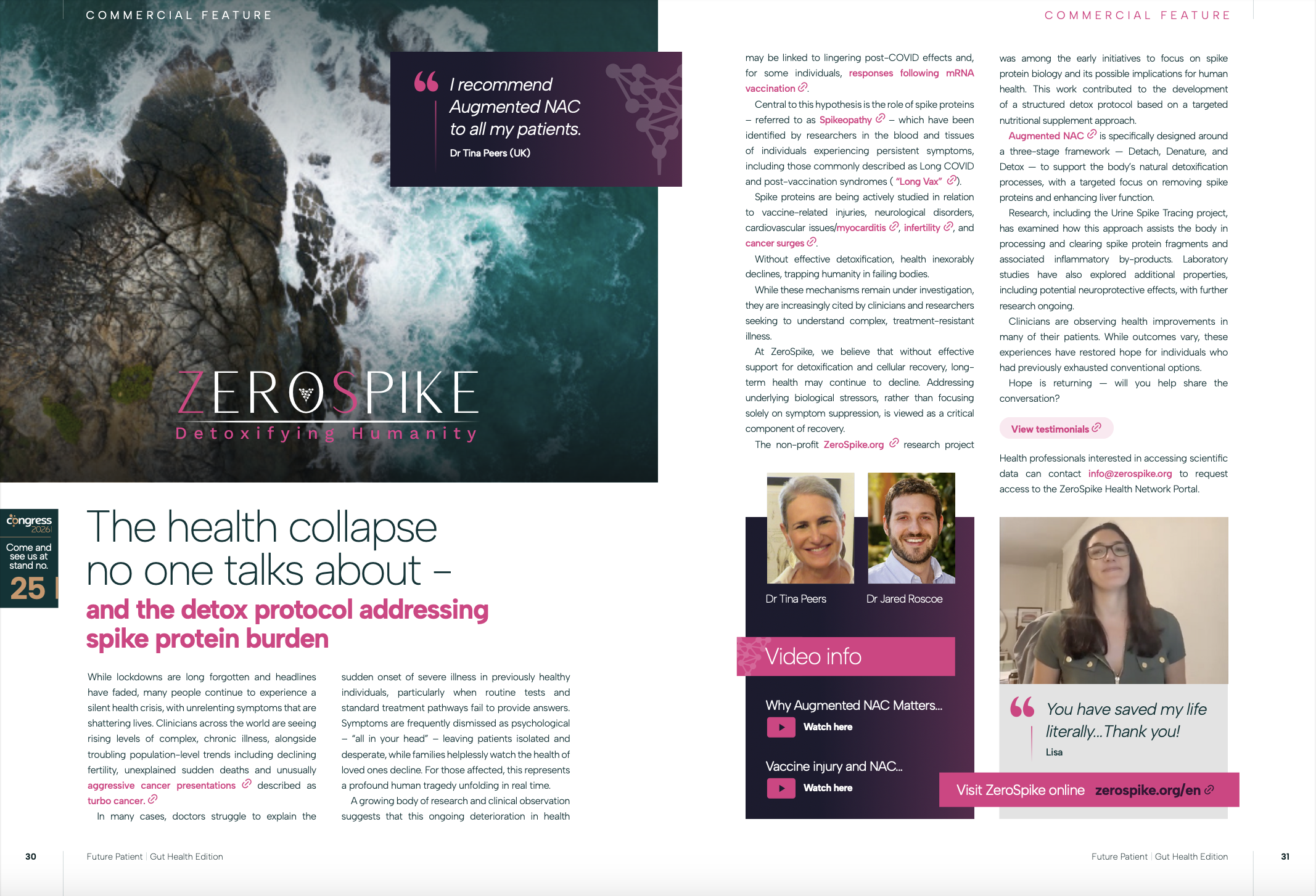 ENDORSEMENTS Join us in our mission to help people regain their health “In a patient with Barrett’s Esophagus, all symptoms improved and spike proteins went down with Augmented NAC. When we see the same results in other patients, we attribute them to its effect.”Dr Anna Forbes UK www.theforbesclinic.co.uk Augmented NAC: Beyond the Spike Protein Detox – Supports Glutamate Regulation and MoreDr Jess Armine Augmented NAC: Fantastic Success Against Spikeopathy!Dr. Klinghardt Spike Shedding Triggers Cytokine Cascade – Rapid Relief with Augmented NAC Dr Allison Peters www.wellcenteredwellness.com The health collapse no one talks about – and the detox protocol addressing spike protein burden futurepatient.co.uk/magazine Spike Proteins, Spikeopathy, Cancer, and Turbo Cancer – Why Augmented NAC MattersDr. Jared Roscoe and Dr. Tina Peers Augmented NAC is a huge leap from standard NACJanel Bilal – www.janelbilal.com The ZeroSpike Project and Augmented NAC were presented to members of the Japanese ParliamentDr. Fukuda Clinical Results of Augmented NAC and Urine Spike Tracing (UST) Augmented NAC Featured in a Talk on Independent Medical Alliance Dr. Tina Peers Workshop on Spikeopathy and Detox Protocol with Augmented NACDr. Tina Peers at the IPM Congress Prf. Yasumasa Inoue and Dr. Katuhiko Fukuda A-NAC SESSION Unraveling spike protein toxicity and exploring detoxification strategyThe Light Magazine UK The truth about spike protein Dr. Tina Peers The Wellness Way Covid “Vaccine” injuries, spike protein and Augmented NAC Dr. Tina Peers and Dr. John Campbell Augmented NAC won Highly Commended (2nd) award by the readers True Health magazine! www.truehealthmagazine.co.uk Augmented NAC won Best New Product award by the readers of Nutrition I-Mag magazine! www.nutritionimag.com Augmented NAC – the Ultimate Spike Protein DetoxIHCAN Magazine Integrated protocol with Augmented NAC Dr. Fukuda Latest promising therapeutic strategies with Augmented NACDr. Pierre Kory Dr. Jess Armine – Augmented NAC presentation Can this treatment bring hope? Sally Beck (TCW) All about Augmented NAC Dr. Saleeby and Scott Marsland FNP-C The ZeroSpike Project and Augmented NAC Dr. Tina Peers – at the Better Way Conference Treatment strategies with Augmented NAC Front Line COVID-19 Critical Care Alliance (FLCCC) Augmented NAC round table The people’s Health Alliance (PHA) Augmented NAC dosage Dr. Haider There Are Ways to Reduce Risks and Damage of Vaccine Adverse Events, Doctors Share Suggestions THE EPOCH TIMES Augmented NAC recommendation Dr. Yusuf (JP) Saleeby, MD